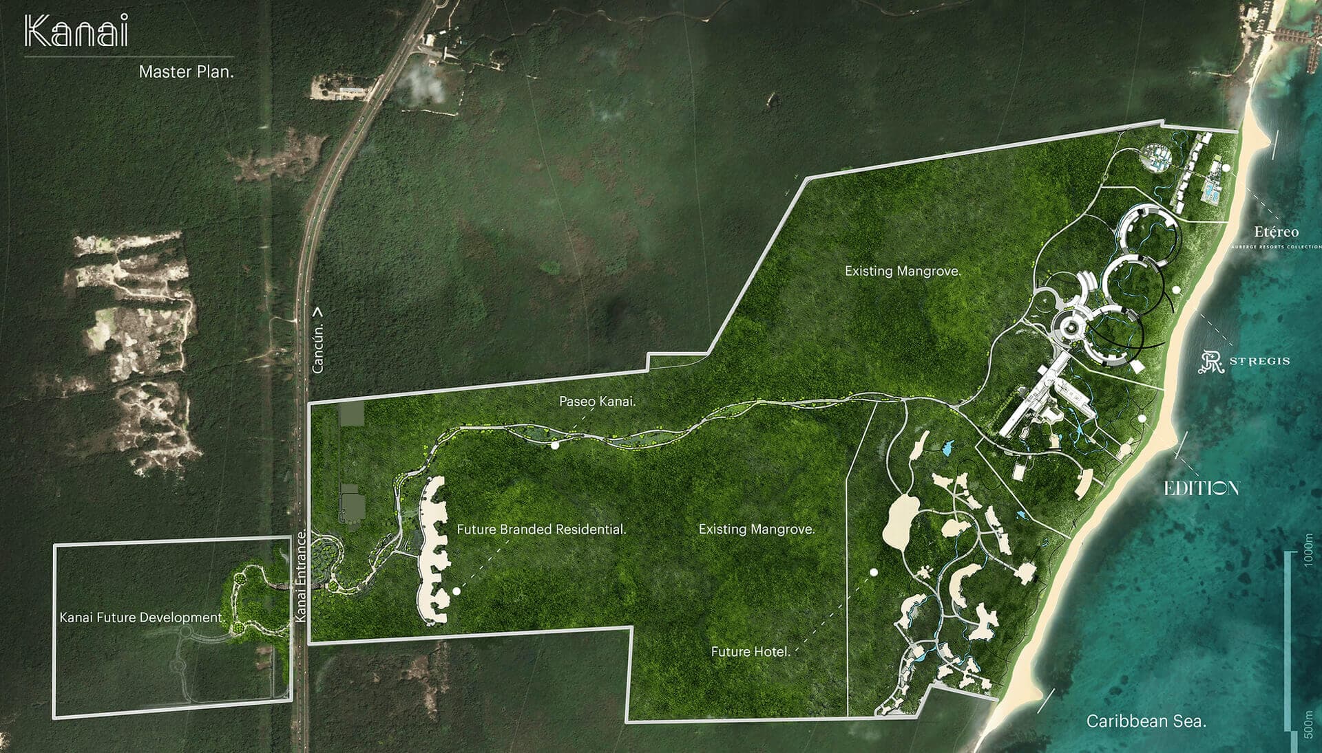 Ubicado en el corazón de la Riviera Maya con su clima tropical durante todo el año, a 30 minutos en auto del aeropuerto de Cancún y a 10 minutos del centro de Playa del Carmen, Kanai es un plan maestro de 680 acres, con solo 4 hoteles de lujo de primer nivel y 700 habitaciones y residencias dentro. La seguridad de una comunidad cerrada segura se encuentra entre una reserva de jungla y manglares en la que apenas el 9% representa la huella de edificios y caminos, teniendo sumo cuidado en preservar el hábitat de una amplia variedad de vida silvestre y naturaleza.